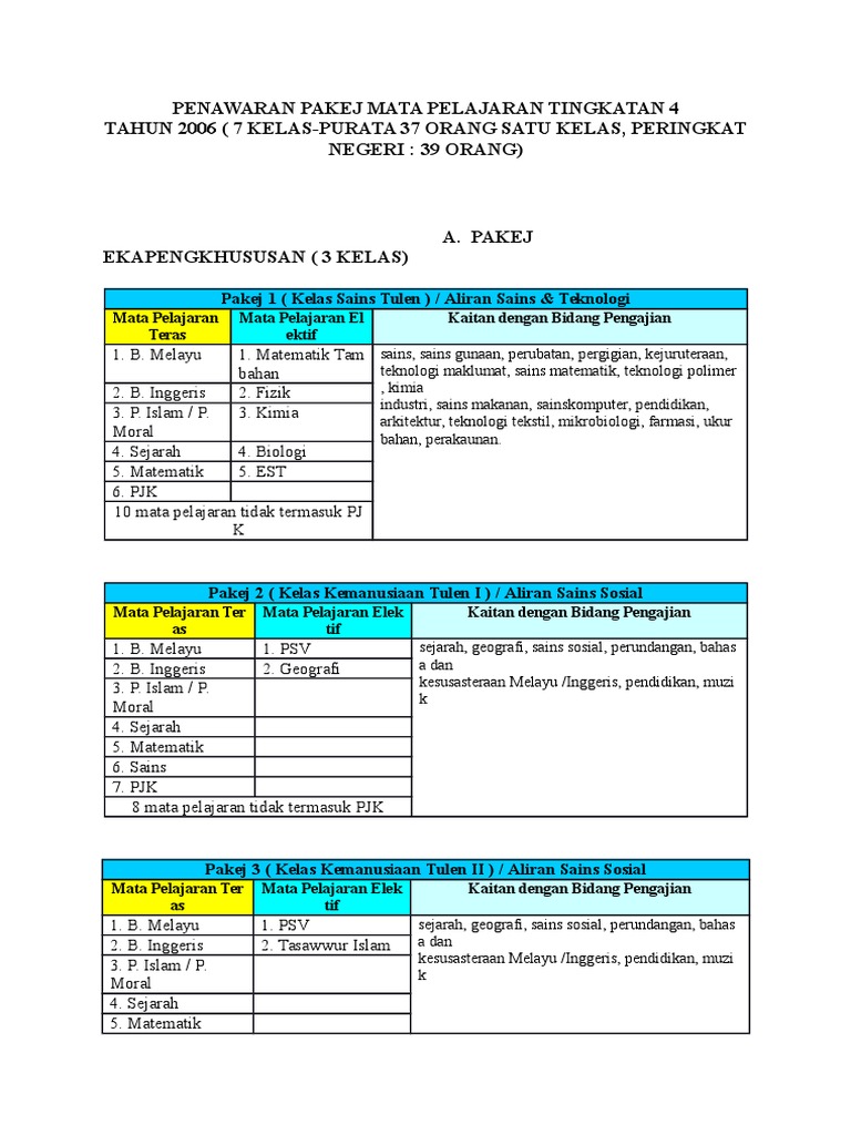 Senarai Aliran Tingkatan 4 Dan Pakej Mata Pelajaran Terkini